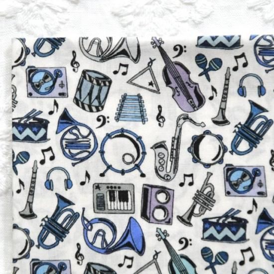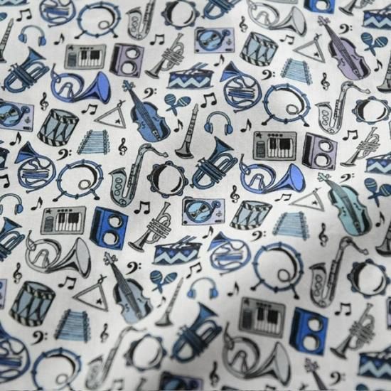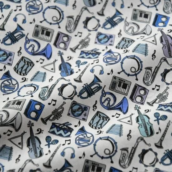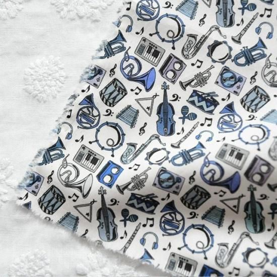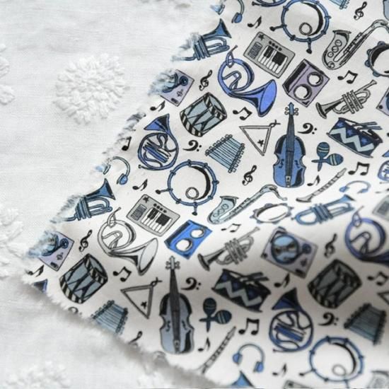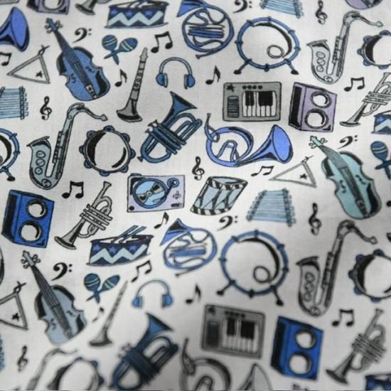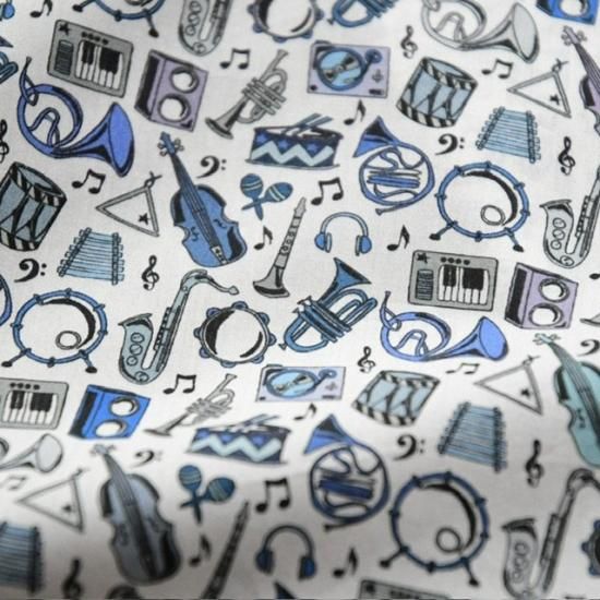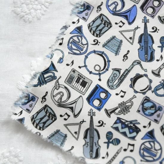 クラシックなレイアウトで描かれた様々な楽器が、新しいカンバセーショナル柄を生み出しました。